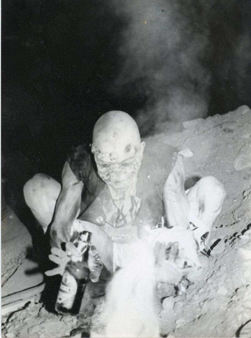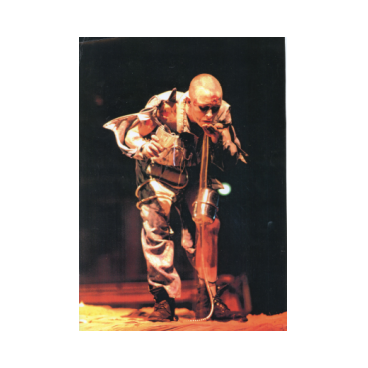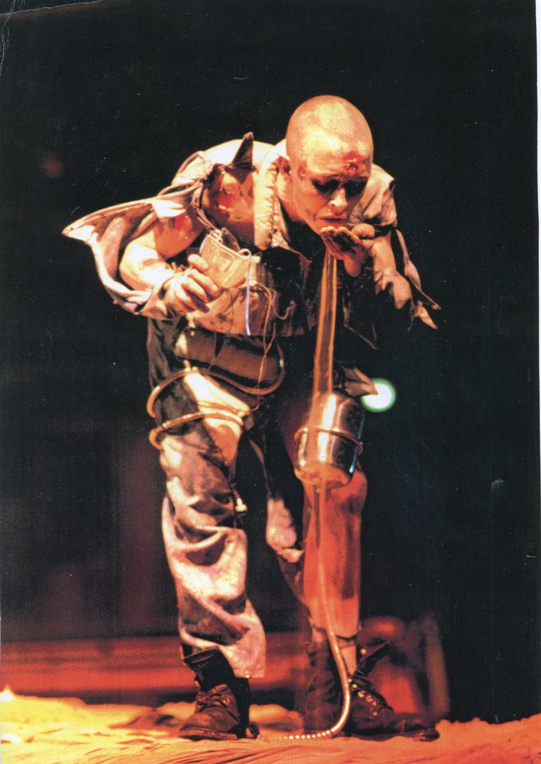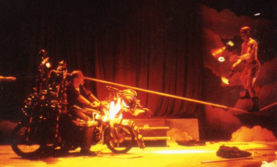 Matilda, a six wheeled, motorized, flame spitting, insect bike (his co-star and only friend) has her own agenda. This causes a constant tension in their relationship. Matilda was originally commissioned for a Dutch film, Sirko by Ineke Smits in 1993. She had seen DNTT perform in Berlin in1992. Paka devised the Matilda show in Spain in 1994 for the wake of a good Spanish friend. His death led to Paka’s departure from Spain.